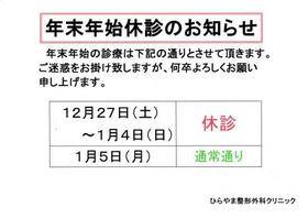 早いもので、今年も残すところ20日余りとなりました。 当クリニックでは、下記の通り年末年始休診させて頂きます。 ご迷惑お掛け致しますが、よろしくお願い致します。
